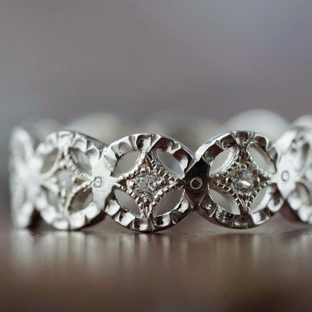 -story- 『始まりの日』 私のイタリア生活始まりの街であり、 新しい挑戦の幕開けになった地「ローマ」 初めてローマの教会に足を踏み入れたとき、 古の職人たちが残した美しいモザイク模様と 壮麗な彫刻が目に飛び込んできました。 異国での新しい生活がスタートしたあの日。 「始まりの日」の希望と勇気を忘れないよう ジュエリーに落とし込みました。 あの教会で見上げた天井や、輝くモザイクを思いだしながら、1つ1つ手作業で透かし、彫りを施しています。 新しいことに挑戦する時このリングが そっと前に進む力を届けますように。 【素材】 Silver925+ロジウムコーティング K18WG+ロジウムコーディング リング幅:約6㎜ リング厚:約1.2mm ※幅広の為通常リング(約3mm着用時)1号UPのサイズがおすすめです。 【注意事項】 デザインの都合上、商品到着後サイズ変更は できかねますのでサイズ選択にご注意ください。 【地金について】 当店では、手彫りによる輝き保てるK18WG。 お手軽に楽しんでいただけるSilver925でお作りしています。 また、どちらもフィレンツェ彫りによる輝きをより長く楽しんで頂くため、ロジウムコーティングを施しております。 ※ロジウムコーティングが剥がれた場合のかけ直しも承ります。お気軽にお問い合わせください。 ※K18WGご希望の場合はお見積もりを出させていただきます。お手数ですが直接instagramDMよりご連絡ください。 【納期】 受注制作のため約1ヶ月ほどで発送いたします。 【保管方法について】 使用後は柔らかい布で拭き、 なるべく空気に触れないよう保管してください。