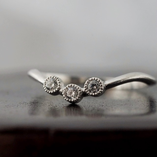 -story- 『蚤の市からのお届けもの』 「bocciolo(ボッチョ-ロ) イタリア語でつぼみ」 人気のbocciolo(ボッチョ-ロ)パールリングの石バージョンです。 咲き始めるつぼみのように小さな石を3つ並べました。 フィレンツェの蚤の市で出会ったジュエリーから着想を得て、蚤の市から届いたようなアンティーク風にお仕立てしました。 石座の側面に施したさりげないフィレンツェ彫りのシルクラインをお楽しみください。 【素材】 Silver925+ロジウムコーティング k18KWG リング幅:約1.3㎜ リング厚:約1.3㎜ ※測る場所により多少の誤差あります。 ダイヤモンド:約2mm(0.03ct) or ホワイトサファイア:約2mm 【注意事項】 デザインの都合上商品発送後のザイズ直し はできかねますので、サイズ選択の際は ご注意ください。 【地金について】 当店では、手彫りによる輝き保てるK18WG。 お手軽に楽しんでいただけるSilver925でお作りしています。 また、Silverにはフィレンツェ彫りによる輝きをより長く楽しんで頂くため、ロジウムコーティングを施しております。 ※K18WGご希望の場合はお見積もりを出させていただきます。お手数ですが直接instagramDMよりご連絡ください 【納期】 受注制作のため制作期間を約1ヶ月半ほど頂いております。 気長にお待ち頂けると幸いです。 【保管方法について】 使用後は柔らかい布で拭き、 なるべく空気に触れないよう保管してください。