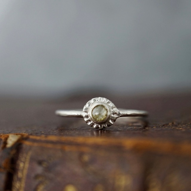 -story- 『わたしの花』 イタリア語で「花」を意味する「fiore」 石座には花びらのような模様を刻みこみ。温かみのあるナチュラルダイヤモンドをあしらいました。 完璧に整えられた宝石ではなく、色や輝き、内に秘めた表情がひとつずつ異なる石。 自然のままの個性を大切にしたリングが「自分だけの花」として日々の中でそっと寄り添う存在になりますように。 【素材】 silver 925 【サイズ】 アーム幅:約1.3mm 厚み:約1.1mm 15号 ※一点ものの為サイズ変更不可、重ね付けしているリングはついてきません。 【納期】 約1週間 【保管方法について】 使用後は柔らかい布で拭き、 なるべく空気に触れないよう保管してください。