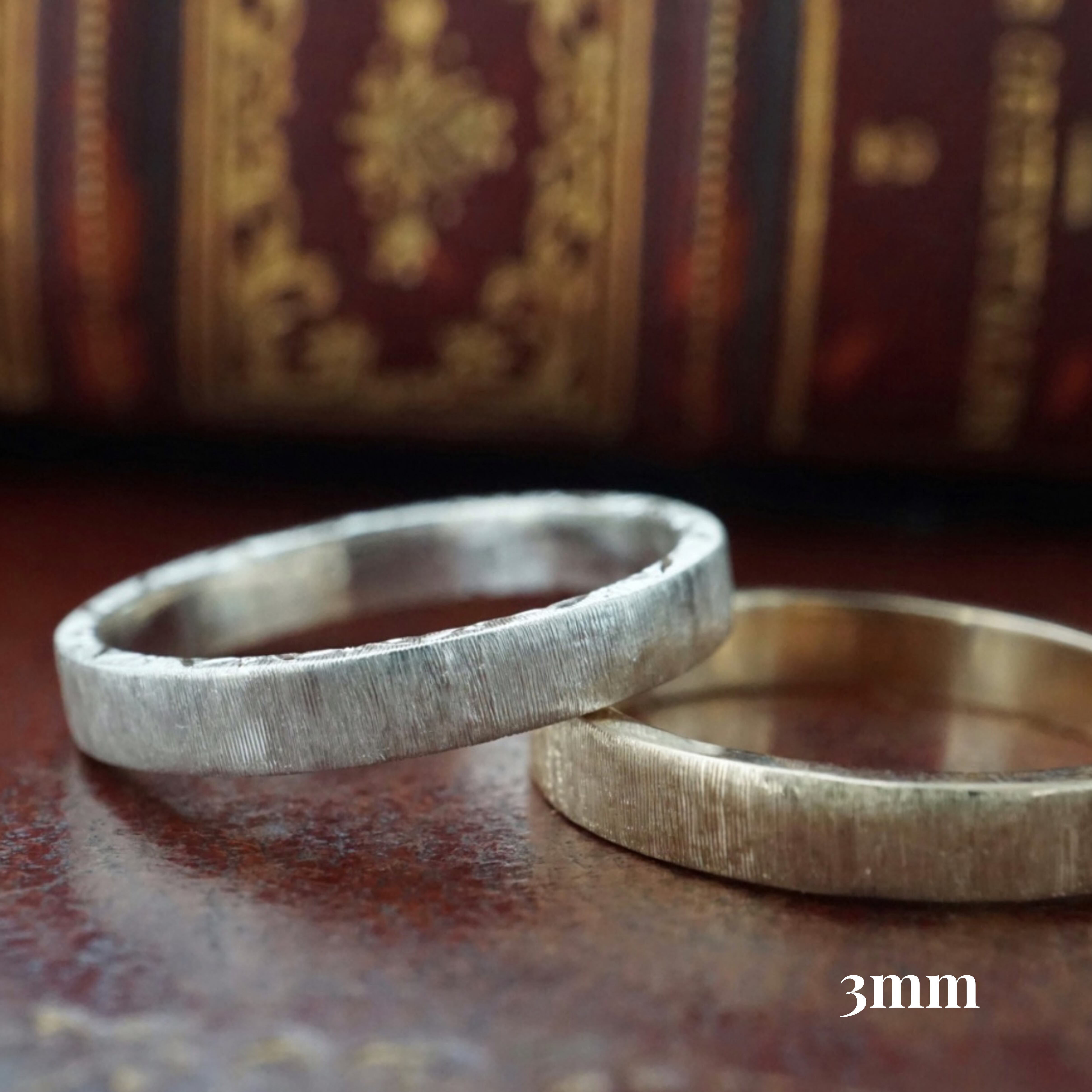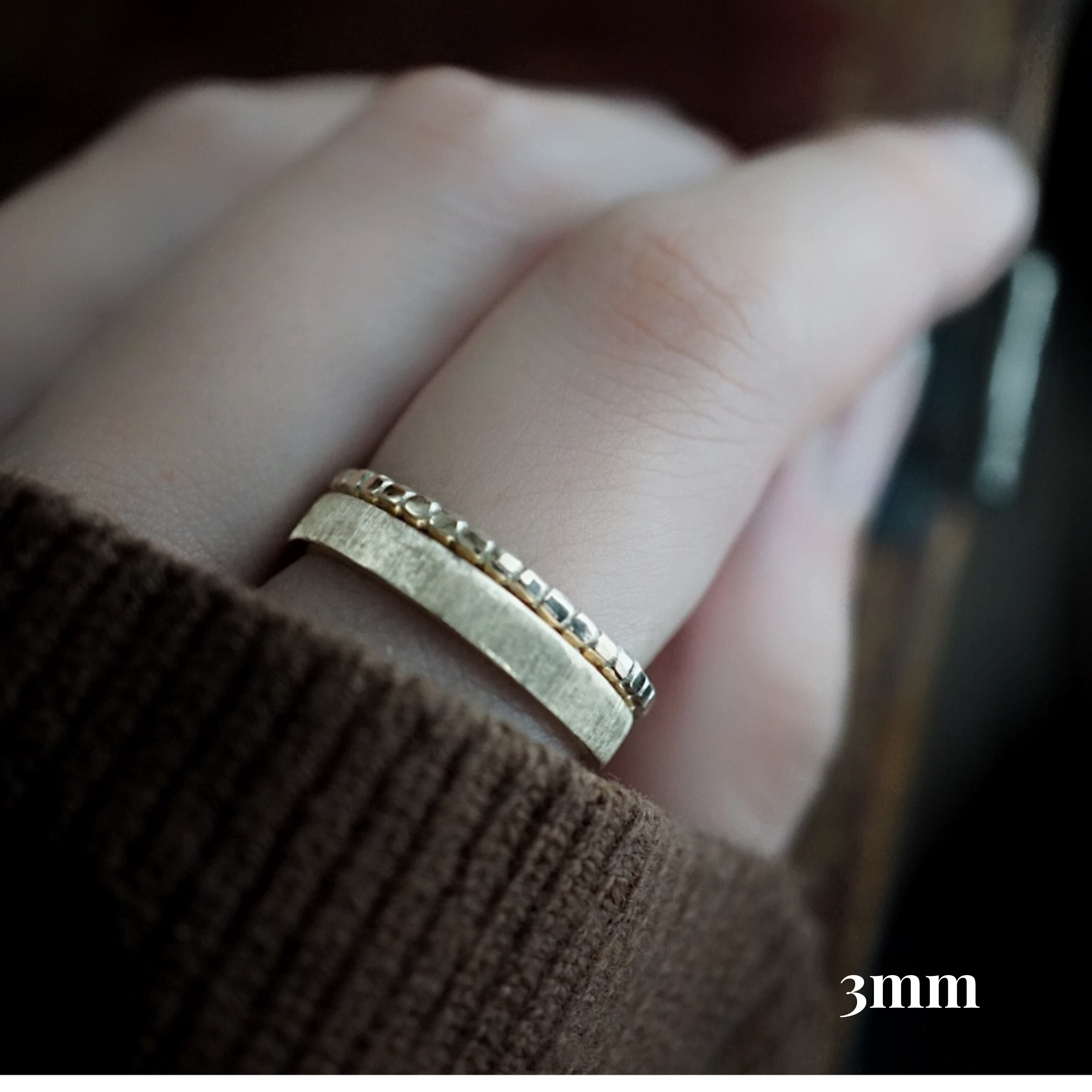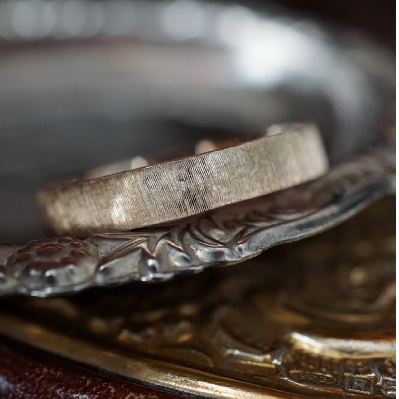 落ち着いた上品な輝きを活かすため、あえてシンプルなシルクラインのみに。そして側面にはさりげない彫りをプラスしています。肌馴染みがよく一本でも重ね付けでも楽しめます。