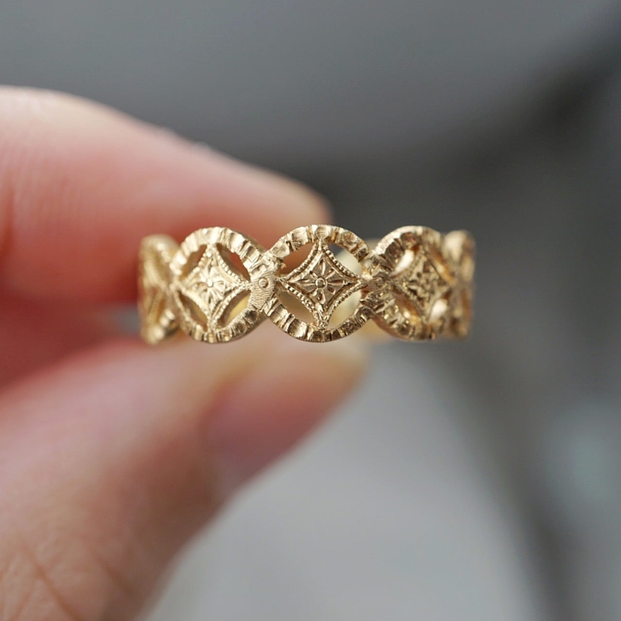 当店では手彫りによる煌めきが保てるK18YGと肌馴染みが良く傷がつきにくいK10YGを採用しております。