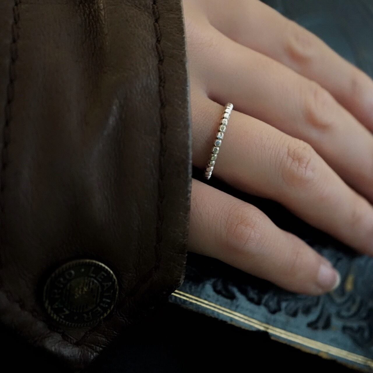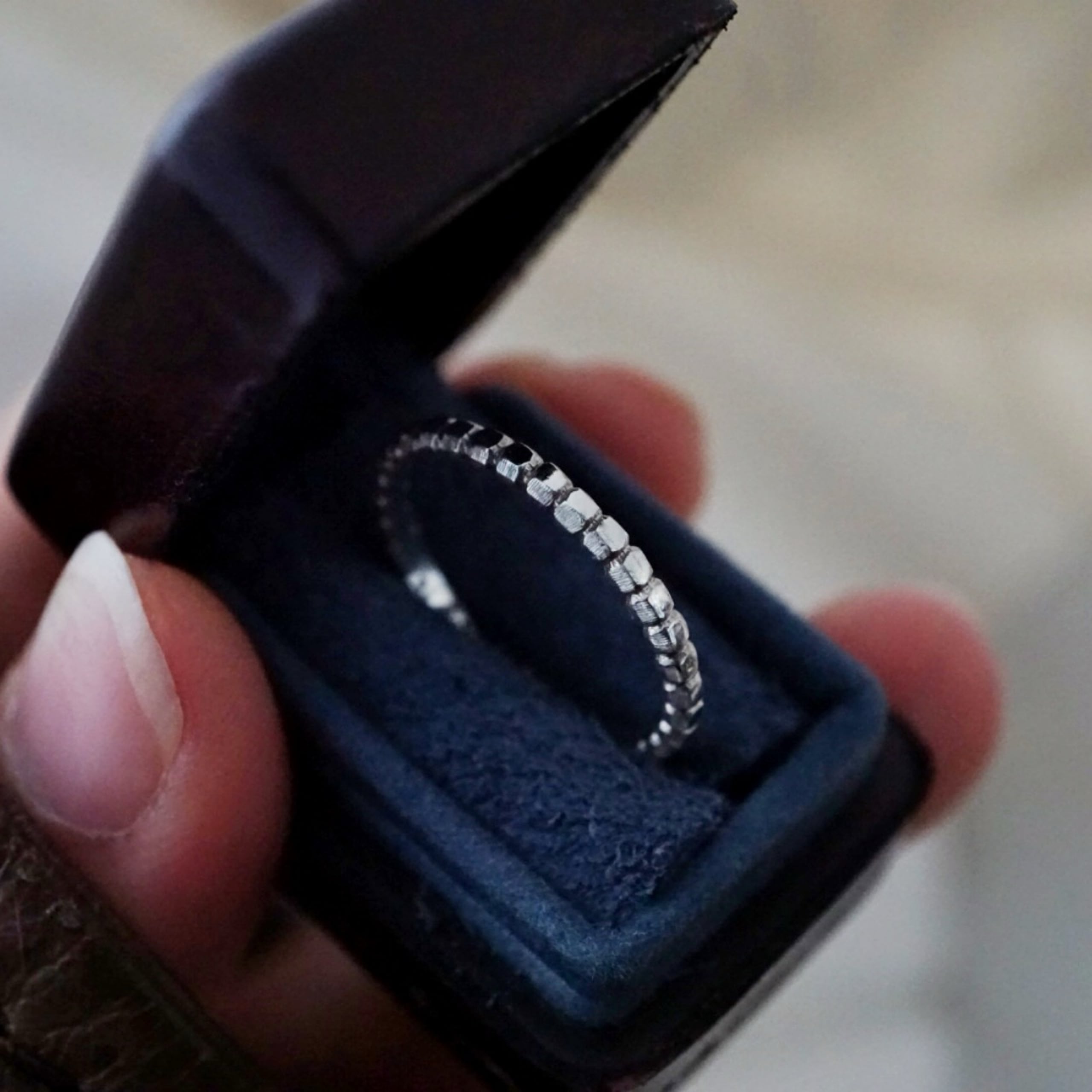 多面角の側面にのみ絹のような彫りを施すことで、光の反射でさりげないく煌めく様をお楽しみ頂けます。